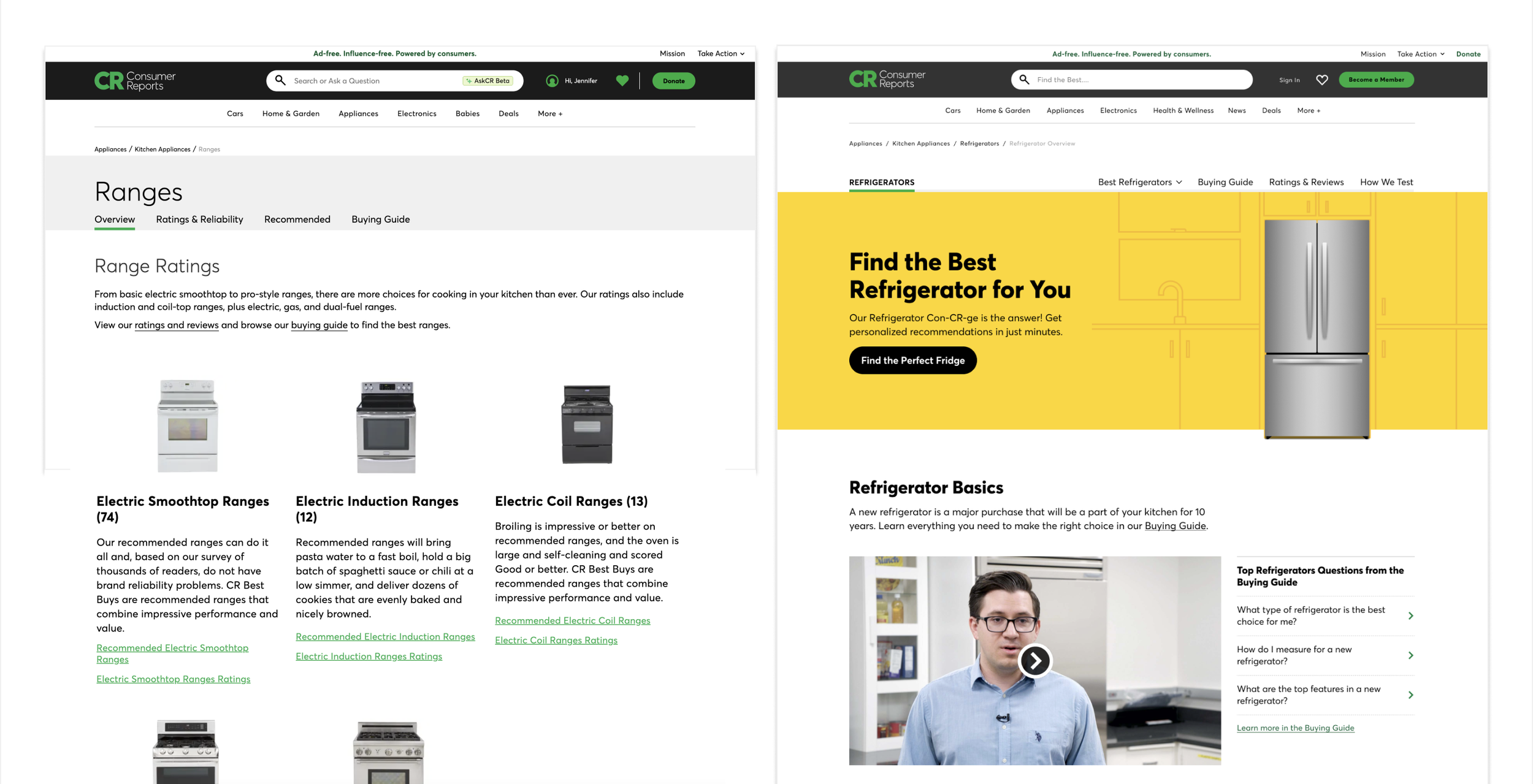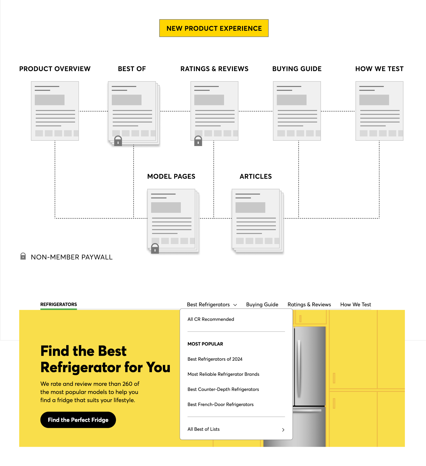 The primary goal was to update outdated product templates to enhance user experience, increase conversion rates, reduce templates and duplication, improve internal linking, and improve SEO performance. The project aimed to create a more cohesive structure that would guide customers in choosing the best product for them, showcasing Consumer Reports’ expertise and value proposition before the paywall, thus encouraging conversions.